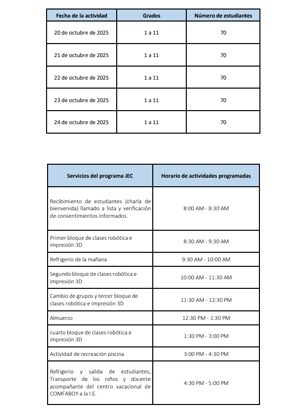 De parte de la Caja de Compensación Familiar de Boyacá – COMFABOY, expresamos nuestro entusiasmo y agradecimiento de su Institución Educativa por haber manifestado su interés de pertenecer a este nuevo proyecto que desarrolla el Grupo Ciclo de Vida a través del programa de Jornadas Escolares Complementarias, COMFABOT. Queremos manifestar nuestro reconocimiento por el valioso trabajo que su institución realiza en el ámbito educativo, especialmente en las zonas rurales y urbanas del Departamento de Boyacá. Por medio de la presente le informamos que su Institución Educativa será participe en el proyecto COMFABOT, el cual busca permitir el acceso de la robótica educativa y la impresión 3D a las instituciones educativas focalizadas, en nuestros centros vacacionales y/o recreo-hoteleros; pues reconocemos la importancia de brindar a los estudiantes la oportunidad de explorar y aprender sobre estas tecnologías emergentes, que no solo fomentan el pensamiento creativo y el aprendizaje práctico, sino que también preparan a los jóvenes para los desafíos tecnológicos del futuro. Debido a lo anterior, la Institución educativa Institución I.E JUAN JOSE NEIRA del municipio de GACHANTIVA, se encuentra programada para realizar la actividad en las siguientes fechas, en el centro vacacional de MONIQUIRA COMFABOY para atender a los estudiantes de su institución de acuerdo con la información de consolidado Matrícula Oficial por Municipio de la secretaria de Educación de Boyacá.